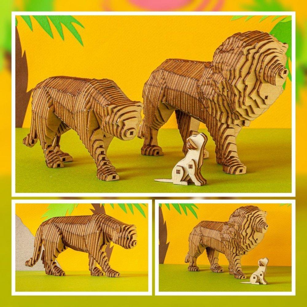Большой набор UNIWOOD из дерева из которого можно собрать сразу 3 фигурки животных: от миниатюрного львенка, собирающегося за пару минут, до средней сложности львицы и большого сложного царя зверей.